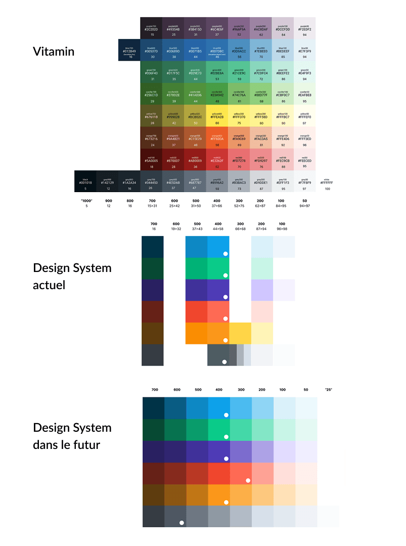 La numérotation des couleurs de Vitamin (le Design System de Décathlon) est liée à la luminosité de la déclinaison : leurs couleurs sont donc "naturellement" cohérentes les unes avec les autres.
